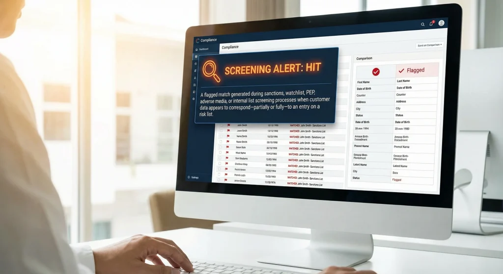 A Hit, commonly referred to as a Screening Alert, is a flagged match generated during sanctions, watchlist, PEP, adverse media, or internal list screening processes when customer data appears to correspond, partially or fully, to an entry on a risk list.