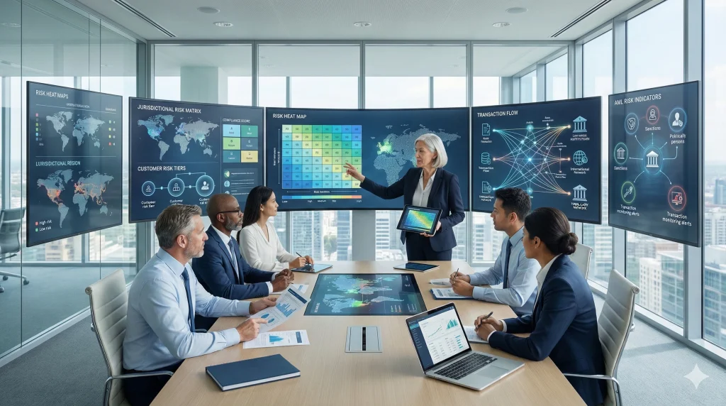 - Transactional Risk: Volume, velocity, cash-intensive flows, unusual patterns.