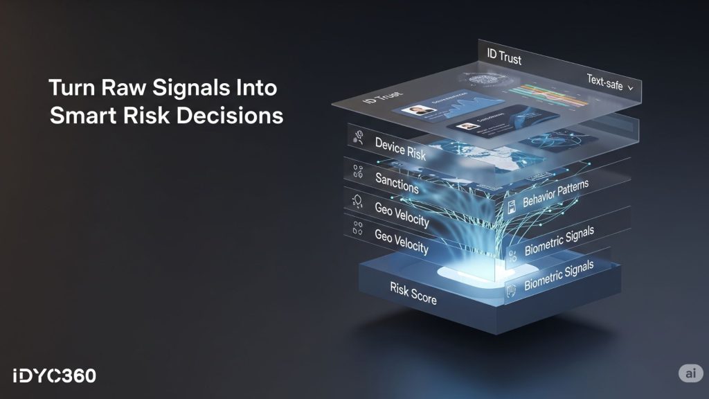 Ingests signals from document checks, device telemetry, geolocation, adverse media, sanctions, and behavioral markers.